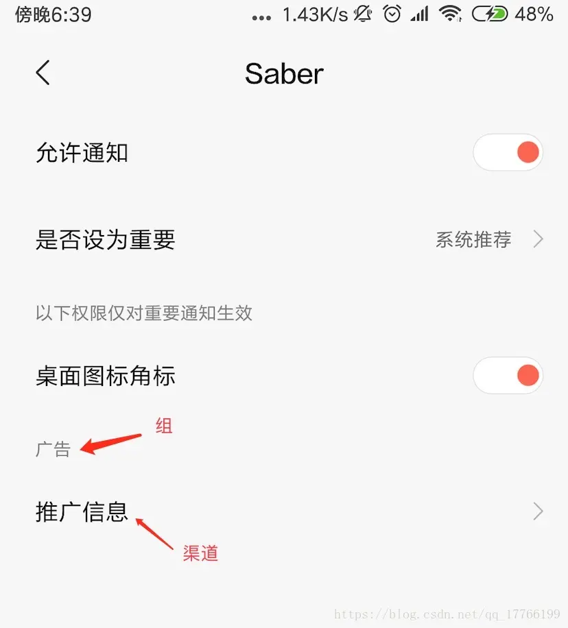 NotificationChannelGroup group = new NotificationChannelGroup(groupId, "广告");
