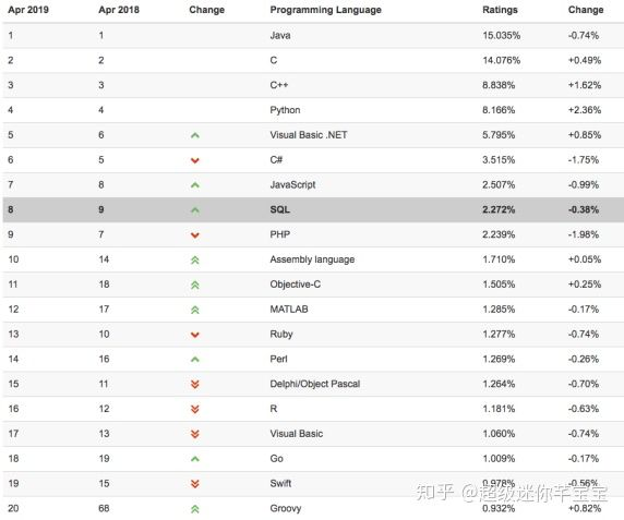 在跟踪主要编程语言的流行程度的TIOBE index[1]中,SQL在2019年4月份的排名是第8。而如果把排名列在11-20之间的SQL的两个“兄弟”PL/SQL, Transact-SQL也合并进来的话,SQL的流行度应该更高。