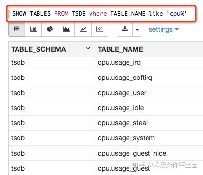 SHOW TABLES FROM tsdb如果我们希望列出所有以cpu为前缀的metric/table,可以在上面的查询基础之上添加附带过滤条件.