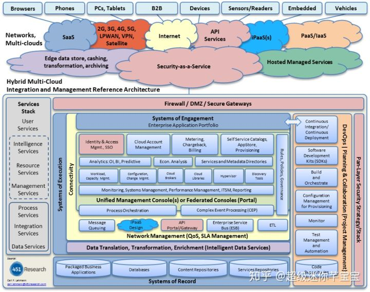 这种背景下的多集群一直以来都以架构复杂著称,具体表现就是各个厂商发布会上令人眼花缭乱的多集群 / 混合云解决方案架构图,如下 图 4 就是一个传统的多集群企业级解决方案架构图,不得不说,我们很难完全理解图中的所有细节。