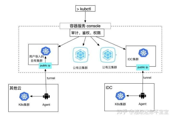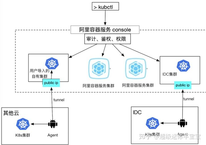 集群隧道会在用户的 Kubernetes 集群里安装一个 agent,使得用户的集群无需公网 IP,就可以被用户像使用公有云上的 Kubernetes 服务一样在公网访问,随时随地愉快的使用、管理、监控自己的集群,拥有统一的鉴权、权限、日志、审计、控制台等等一系列的功能。