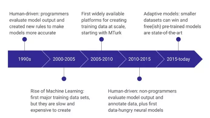本世纪前10年后期,亚马逊的MTurk掀起了一股训练数据现收现付的潮流,这改变了人们对训练数据建构的看法。此时学术界也兴起了一场小规模的运动,主动学习崛起为一种人工标注的策略,用于帮助注释员挑选正确的数据。