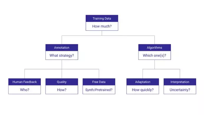 在面对训练数据的不同应用实例时,经常会用到相似的策略,例如,我们需要多少数据?谁来标注比较合适?如何衡量标注质量?是否可以用合成数据或者预先训练过的模型来标注数据,以降低人工注释的薪水成本?在算法方面,如何迅速使模型适应新的标注数据?又如何解释模型的不确定性,以帮助人们在检查中对未标注数据进行正确采样?