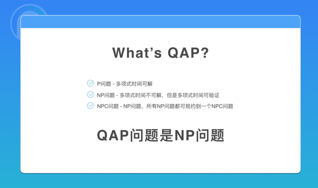 而我们今天谈的 QAP 问题,其实是 NP 问题。也是说 QAP问题可以在多项式时间内验证一个解是否正确,但在一个有限的时间内,使用有限的资源是很难在多项式时间内推出一个正确的解的。