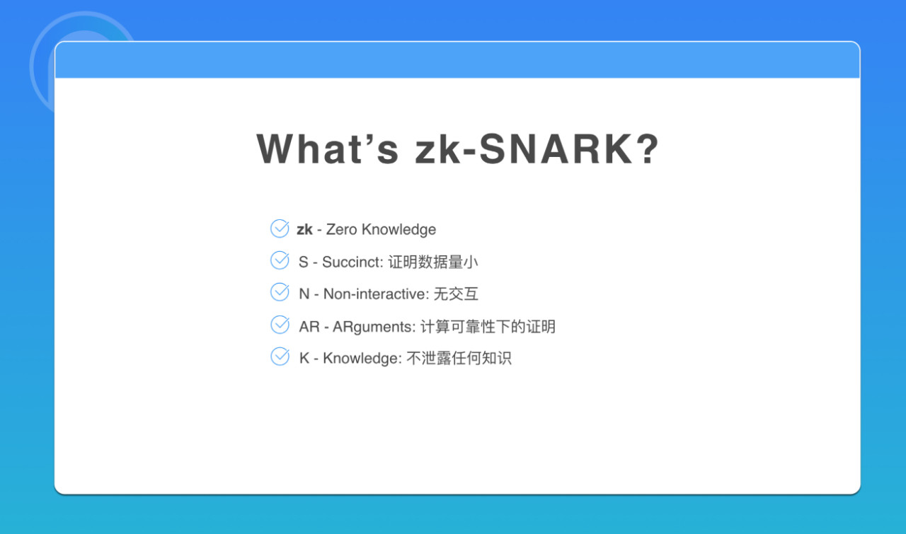现在我们来详细解释一下,零知识证明(zh-SNARK)是 zero-knowledge Succint Non-interactive ARguments of Knowledge 的缩写。其中: