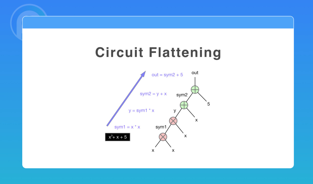 首先,我们将计算性问题 “拍平(Flattening)”,使之变成一个个电路,例如 x3 + x + 5,我们可以将其拍平成 4 个电路
