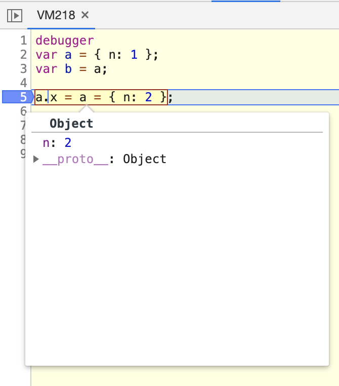 所以,我在step 3和step 4的时候,先是选择了a = {n:2},然后又选择了整句a.x = a = {n:2}