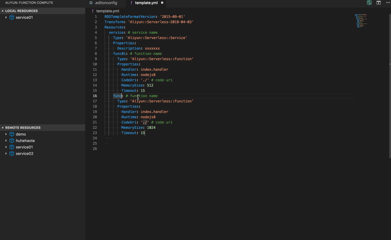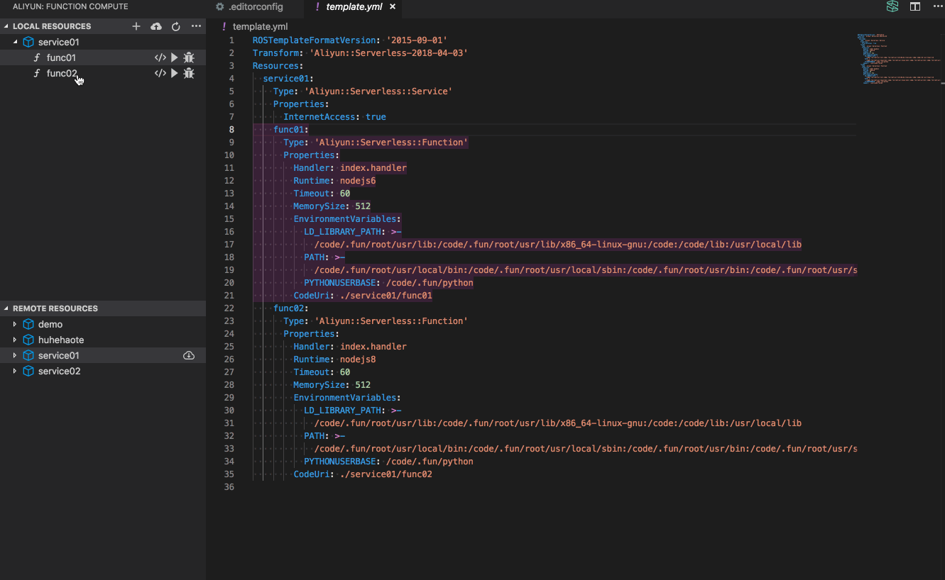 - 从本地资源面板跳到模版文件 template.yml 时对应资源描述块会高亮显示。在本地资源面板左击服务名或函数名,会跳转至 template.yml 文件并将相关服务或函数描述块的背景会高亮并逐渐退去。