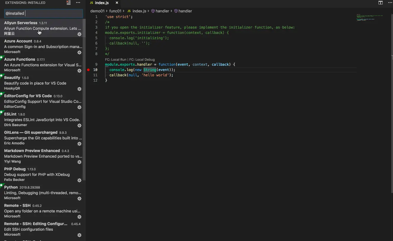 Aliyun Serverless VSCode Extension 是阿里云 Serverless 产品 函数计算 Function Compute 的 VSCode 插件,该插件结合了函数计算 Fun 工具以及函数计算 SDK ,是一款 VSCode 图形化开发调试函数计算以及操作函数计算资源的工具。