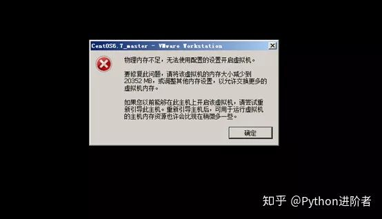 前几天给大家分享了如何在VMware中安装CentOS系统,后来有小伙伴在群里咨询,当新建虚拟机之后,打开虚拟机会弹出“物理内存不足,无法使用配置的设置开启虚拟机”的问题,如下图所示。这里会给出提示,让你将虚拟机内存大小减少到20352MB。