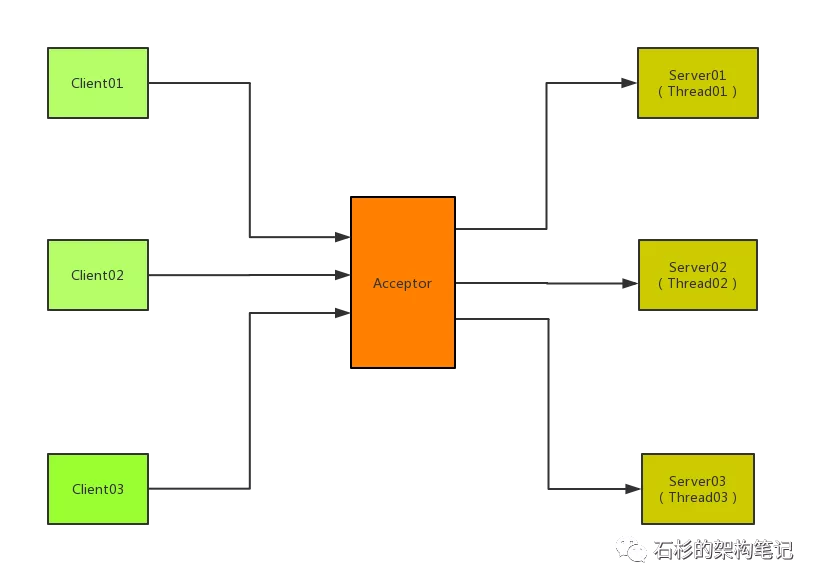 如果是基于多线程的模式来的话,就是这样的模式,这种也是Acceptor线程模型。