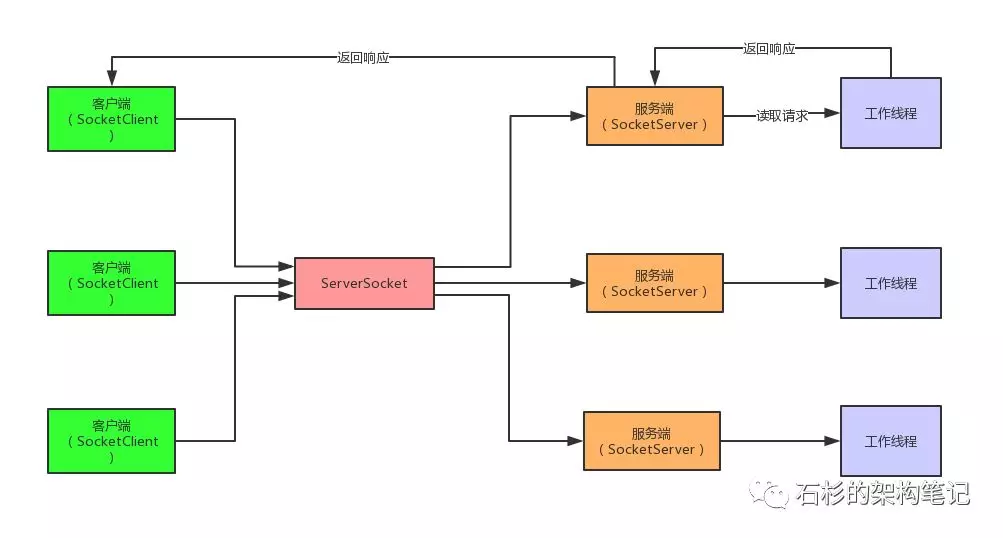 它其实就是服务端创建一个ServerSocket, 然后就是客户端用一个Socket去连接服务端的那个ServerSocket, ServerSocket接收到了一个的连接请求就创建一个Socket和一个线程去跟那个Socket进行通讯。