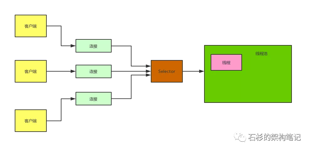 其实相当于就是一个线程处理大量的客户端的请求,通过一个线程轮询大量的channel,每次就获取一批有事件的channel,然后对每个请求启动一个线程处理即可。