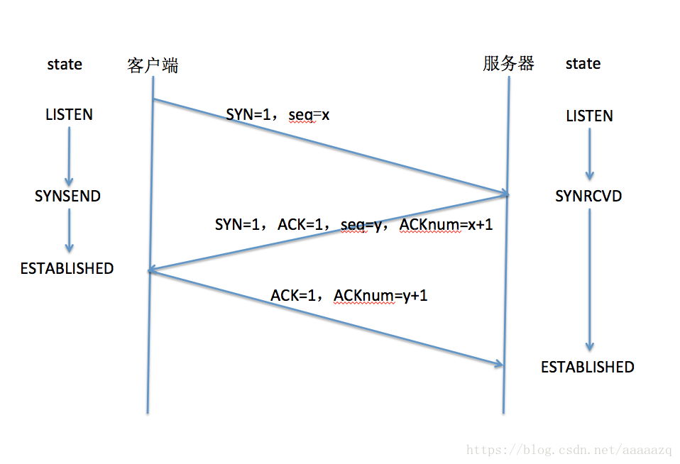 第二次握手(SYN=1,ACK=1,seq=y,ACKnum=x+1):