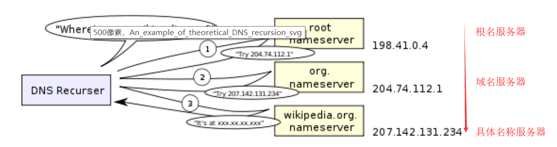 - 迭代查询则是DNS客户端自己为中心的,是各个服务器和服务器之间的查询活动,迭代查询的过程中“查询的递交者”一直没变化,其结果是间接告诉DNS客户端另一个DNS服务器的地址。