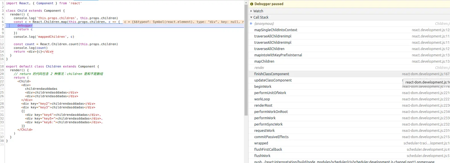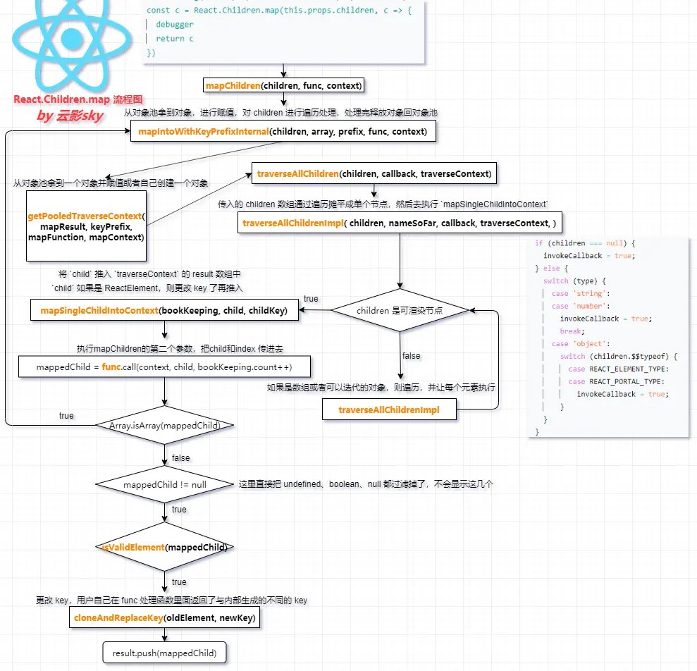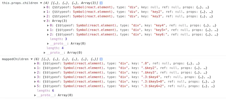 React.Children.map 就是把传进去的 this.props.children 全部摊平,最后返回的一定是一维数组,数组中的对象都会添加上 key 属性。对 mappedChildren key 的生成做分析如下。