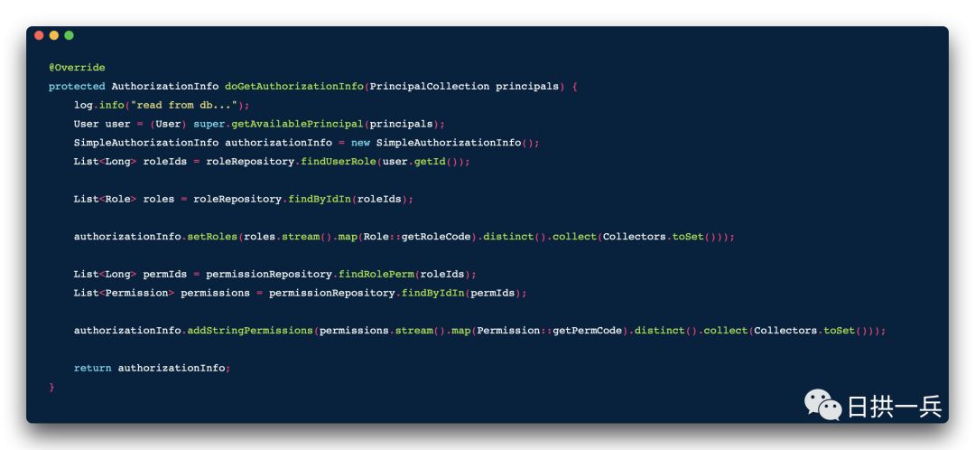 自定义 CustomRealm (主要重写 doGetAuthorizationInfo) 方法: