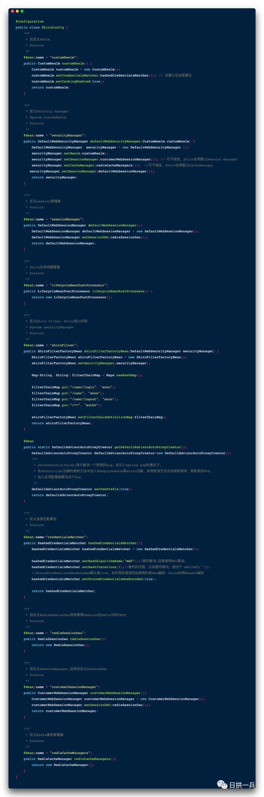 /** * 自定义RedisSessionDao用来管理Session在Redis中的CRUD * @return */@Bean(name = "redisSessionDao")public RedisSessionDao redisSessionDao(){ return new RedisSessionDao();}/** * 自定义SessionManager,应用自定义SessionDao * @return */@Bean(name = "customerSessionManager")public CustomerWebSessionManager customerWebSessionManager(){ CustomerWebSessionManager customerWebSessionManager = new CustomerWebSessionManager(); customerWebSessionManager.setSessionDAO(redisSessionDao()); return customerWebSessionManager;}/** * 定义Security manager * @param customRealm * @return */@Bean(name = "securityManager")public DefaultWebSecurityManager defaultWebSecurityManager(CustomRealm customRealm) { DefaultWebSecurityManager securityManager = new DefaultWebSecurityManager (); securityManager.setRealm(customRealm); securityManager.setSessionManager(customerWebSessionManager()); // 可不指定,Shiro会用默认Session manager securityManager.setCacheManager(redisCacheManagers()); //可不指定,Shiro会用默认CacheManager// securityManager.setSessionManager(defaultWebSessionManager()); return securityManager;}/** * 定义session管理器 * @return */@Bean(name = "sessionManager")public DefaultWebSessionManager defaultWebSessionManager(){ DefaultWebSessionManager defaultWebSessionManager = new DefaultWebSessionManager(); defaultWebSessionManager.setSessionDAO(redisSessionDao()); return defaultWebSessionManager;}