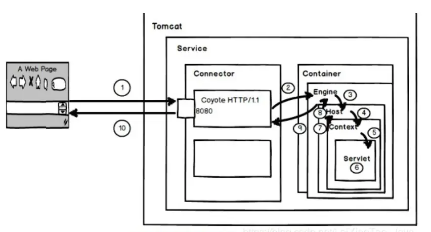 - 请求被发送到本机端口8080,被在那里侦听的Coyote HTTP/1.1 Connector获得