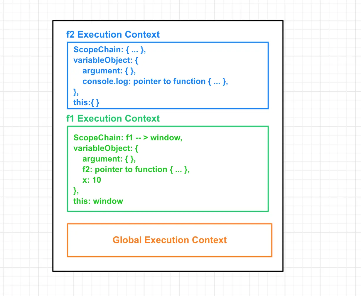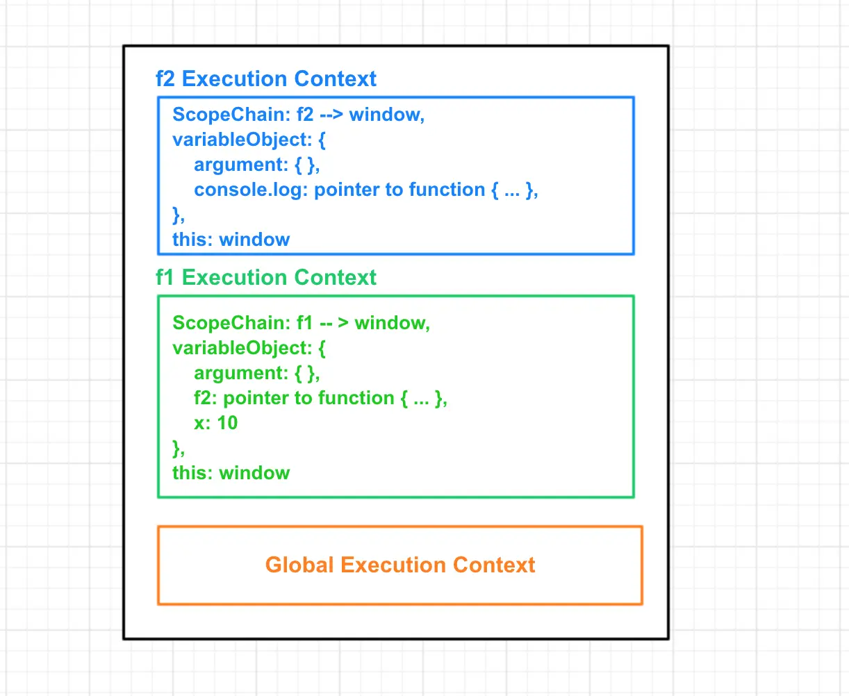 - 执行f1函数。调用函数f2,再次创建新的执行上下文并入栈顶;