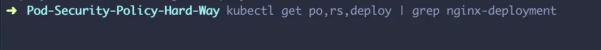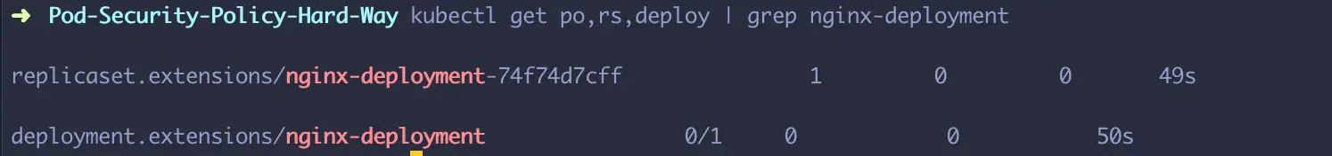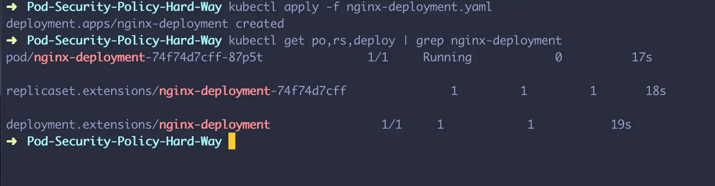 已经定义了restrictive policy并且将对应的psp绑定到对应的service account,我将通过重新生成开篇的deployment资源来验证pods是否可以创建。