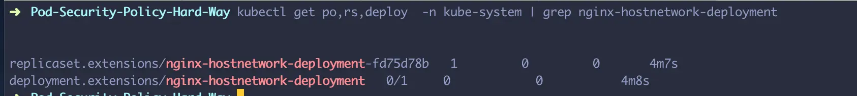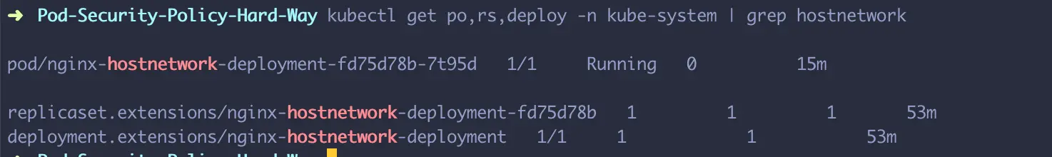 在这部分,我将在deployment中使用已经在restrictive policy中禁止的“hostNetwork”。