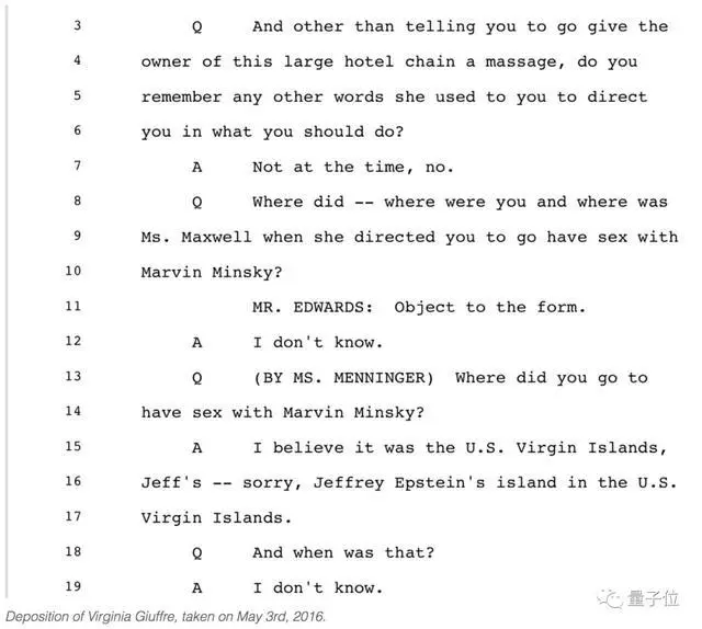 而参与杰弗里·爱泼斯坦一案举证的,有一位名为弗吉尼亚·吉弗尔(Virginia Giuffre)的女性,在最新曝出的证词中,她表示2001年曾在指示,要求与明斯基发生性关系。