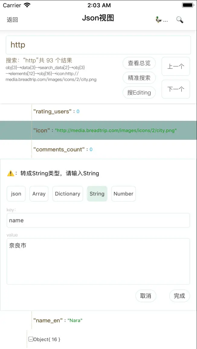 APP端对json原数据的展示并不明朗。 修改网络数据只能通过Charles等抓包工具实现,受到的限制太多,所以诞生了在APP端直接对json进行查看、修改的Json视图工具:BaseJsonViewController。后续会对