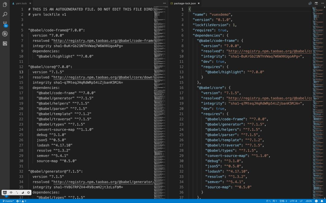 在上图中,我们可以看到,新的 npm5 中的package-lock.json与yarn.lock在视觉上是非常相似的。