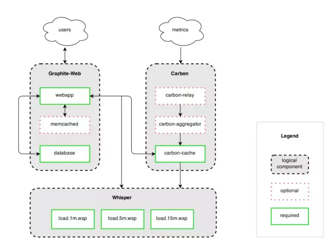 2. Graphite 是一套Python写的开源编程接口,主要是用来收集服务器的及时状态,在这里主要作为statsd的数据后端。分为了三个子项目
