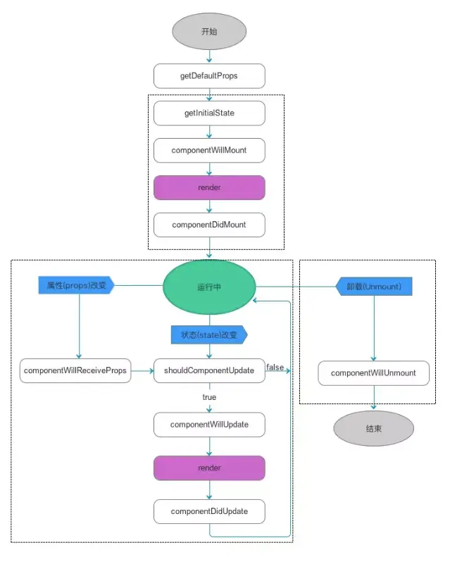 - 运行中: componentWillReceiveProps:在组件接受新的props时调用 shouldComponentUpdate:返回一个bool值,在接受新的props和state时调用,用来判断是否需要刷新。初始化不调用 componentWillUpdata:在组件接受新的props和state时但还没render时调用。初始化不调用 componentDidUpdate:在组件更新完成之后调用。