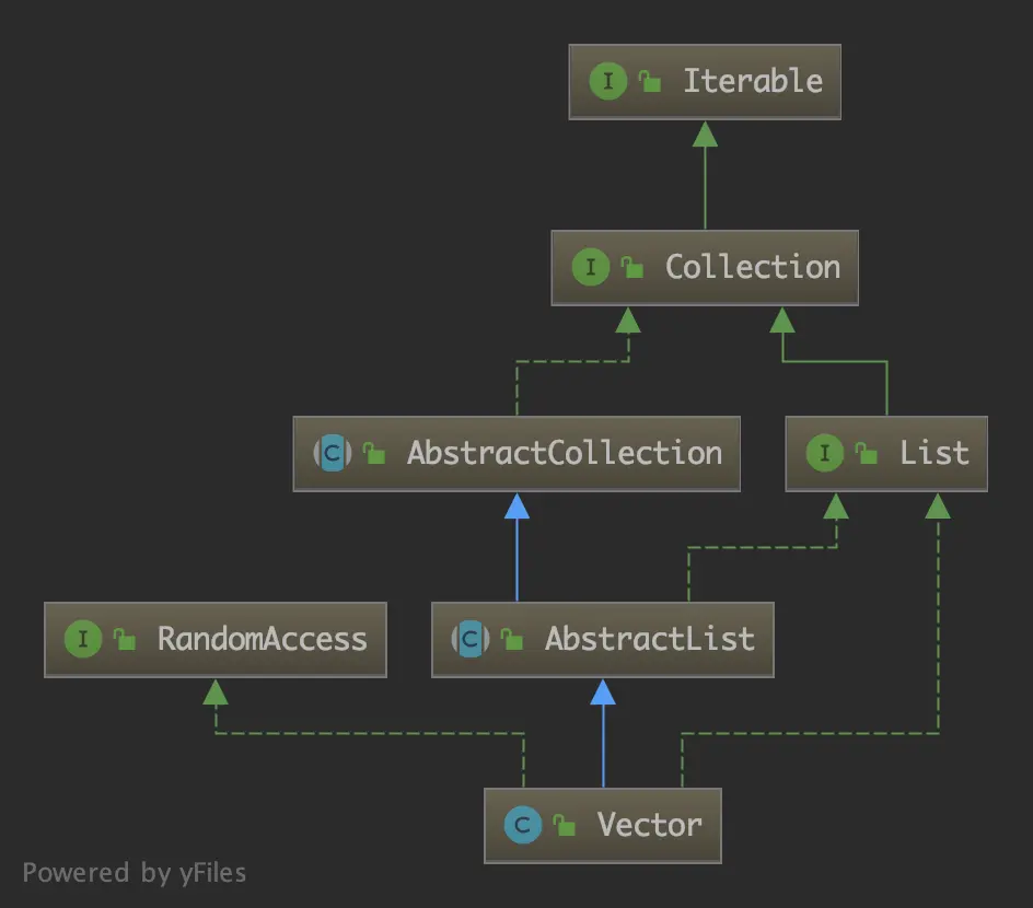 Vector 的内部实现与 ArrayList 类似,也可以理解为一个「可变数组」。其继承结构如下(省略部分接口):