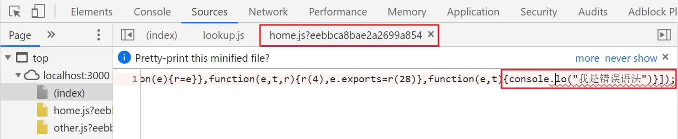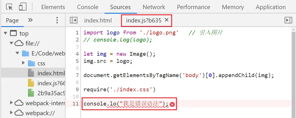 Webpack在工作的过程中,会对代码进行打包编译,这就会带来一个问题:如果项目中代码错误,浏览器中的报错提示,定位到的是打包编译后的代码,而不是我们在项目中实际书写的代码,比如以下报错: