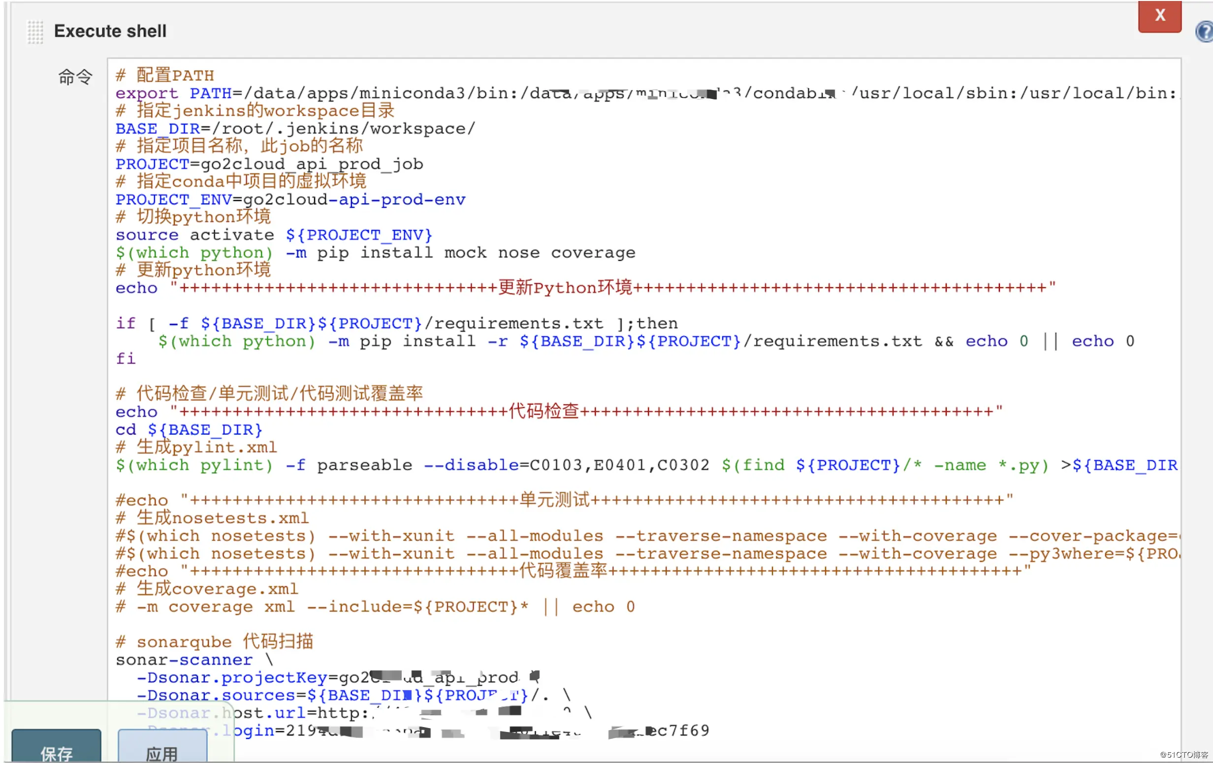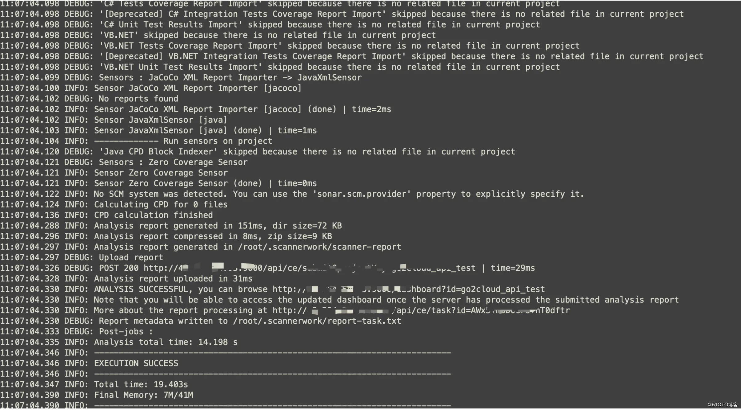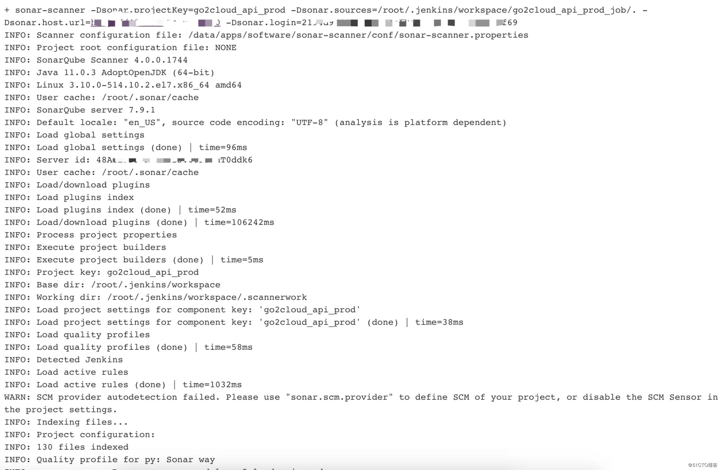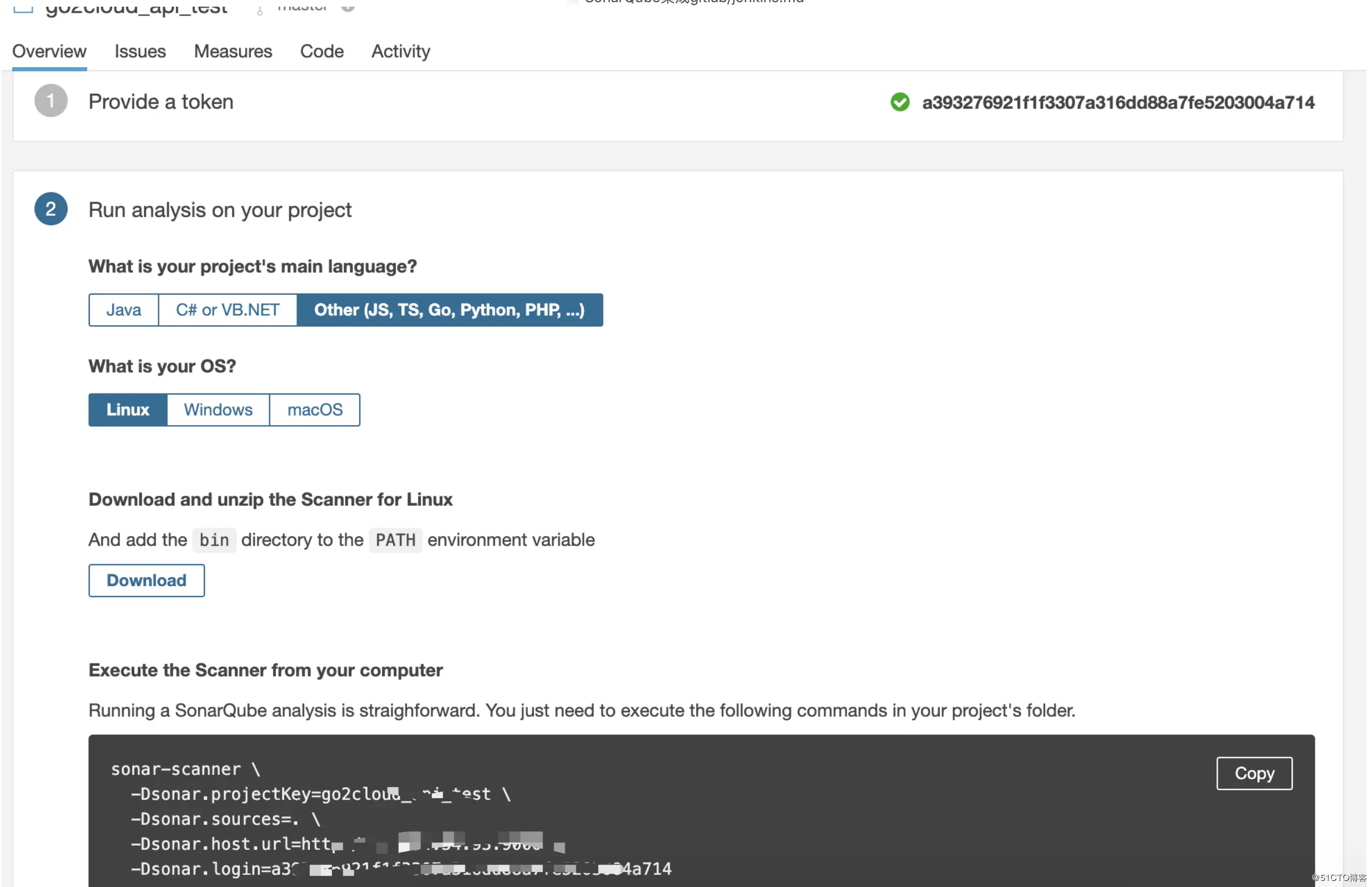 - sonar-scanner -Dsonar.projectKey=go2cloud_api_test -Dsonar.sources=/. -Dsonar.host.url=http://43.xxx.xxx.xxx:9110 -Dsonar.login=a393276xxxxxxxxxxxxxxxxxxx03004a714
