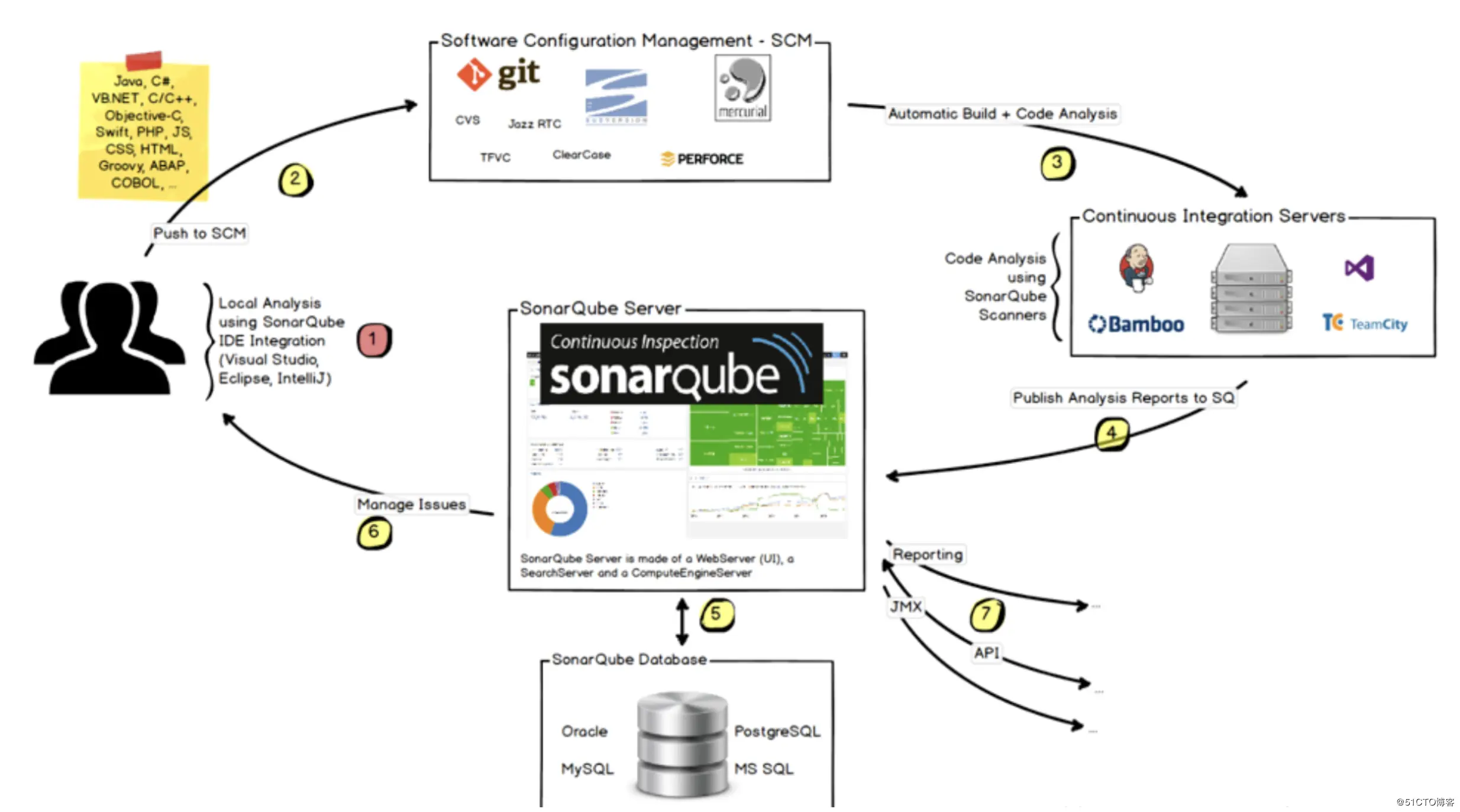 开发人员把代码push到SCM(如gitlab)->jenkins构建定义好的job,然后通过jenkins 插件(sonar scanner)分析源码->jenkins/gitlab-ci 中的scanner客户端把分析报告发到sonarqube server