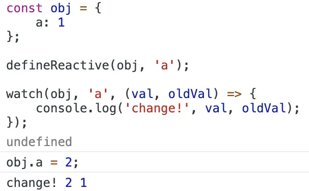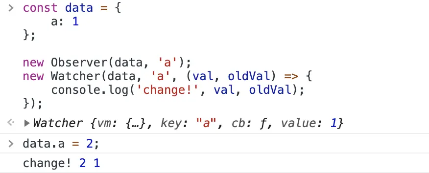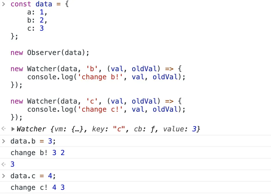 我们在全局定义了一个target变量,它用来保存cb的值,然后在set中调用。所以,cb什么时候被保存在target中?回到出发点,我们要调用watch函数来观测data的key属性,当值被修改时执行我们定义的回调cb,这就是cb被保存在target中的时机了: