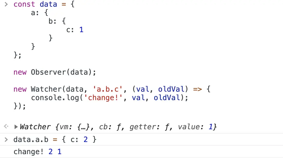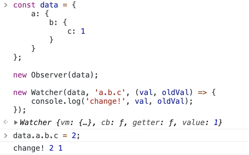 我们在walk方法中做了判断,如果key的属性值val是个纯对象,那就调用walk方法去遍历其属性值。既然是深度观测,那watcher类中的key的用法也发生了变化,比如说:'a.b.c',那我们就要兼容这种嵌套key的写法: