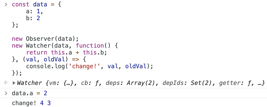 这种写法相当于观测一个表达式,类似与Vue中computed,依赖会被收集到属性a与属性b的dep中,无论修改其中任一,只要表达式的值发生变化,依赖都将会触发。