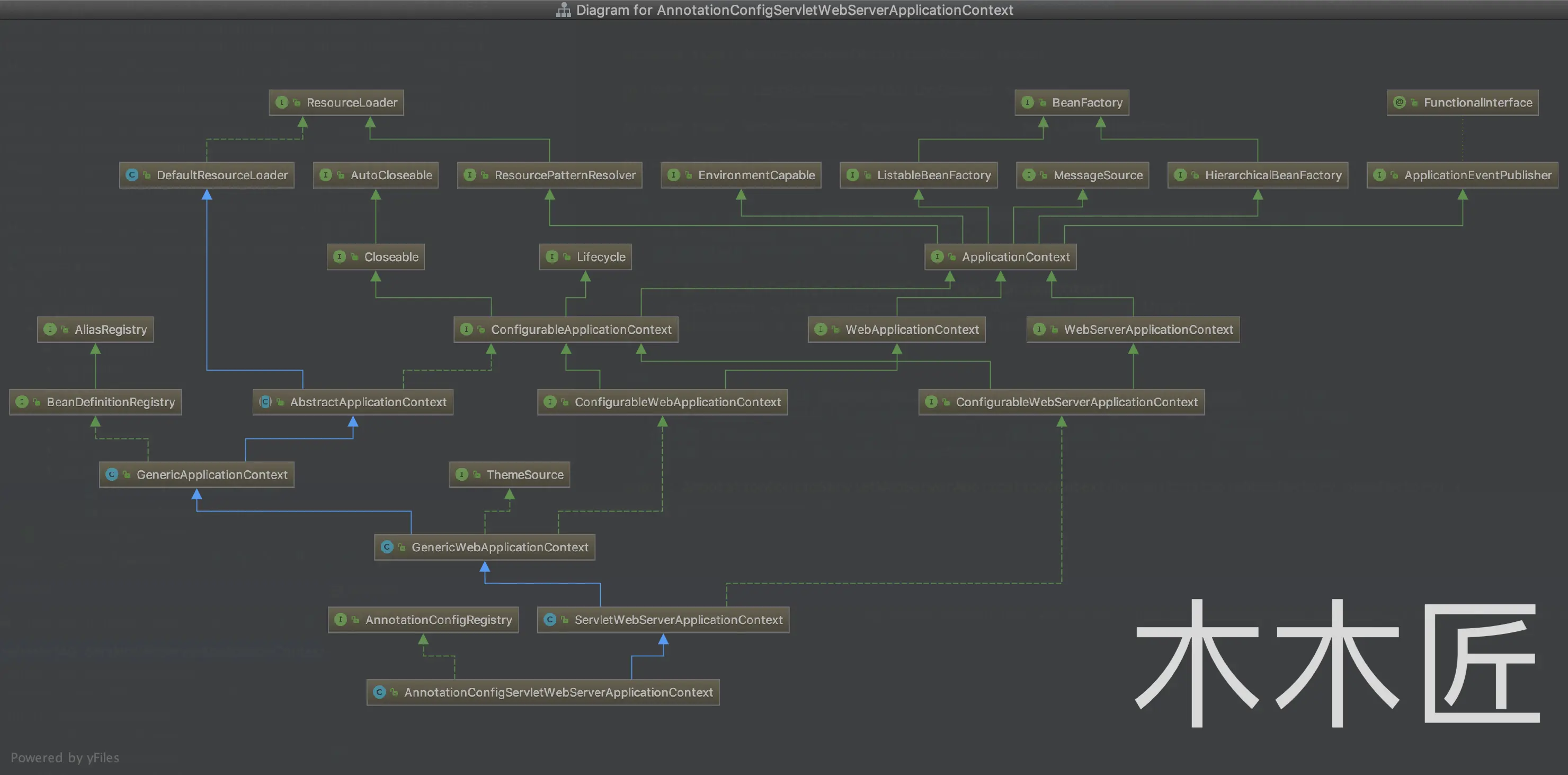 DEFAULT_SERVLET_WEB_CONTEXT_CLASS指定的类,也就是AnnotationConfigServletWebServerApplicationContext类,我们来用图来说明下这个类的关系