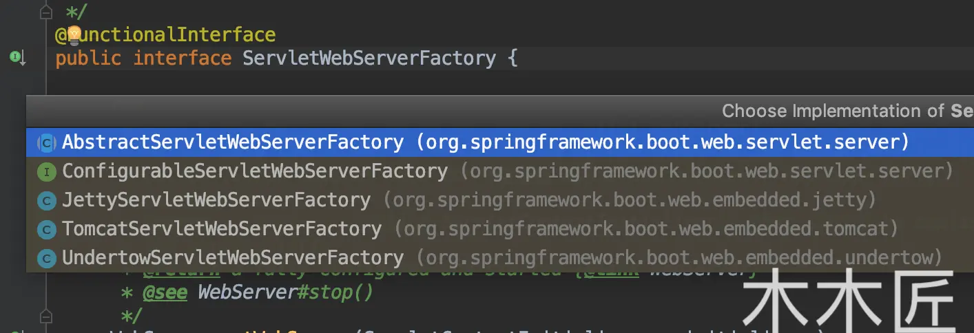 这里就是根据我们的webApplicationType 来判断创建哪种类型的Servlet,代码中分别对应着Web类型(SERVLET),响应式Web类型(REACTIVE),非Web类型(default),我们建立的是Web类型,所以肯定实例化