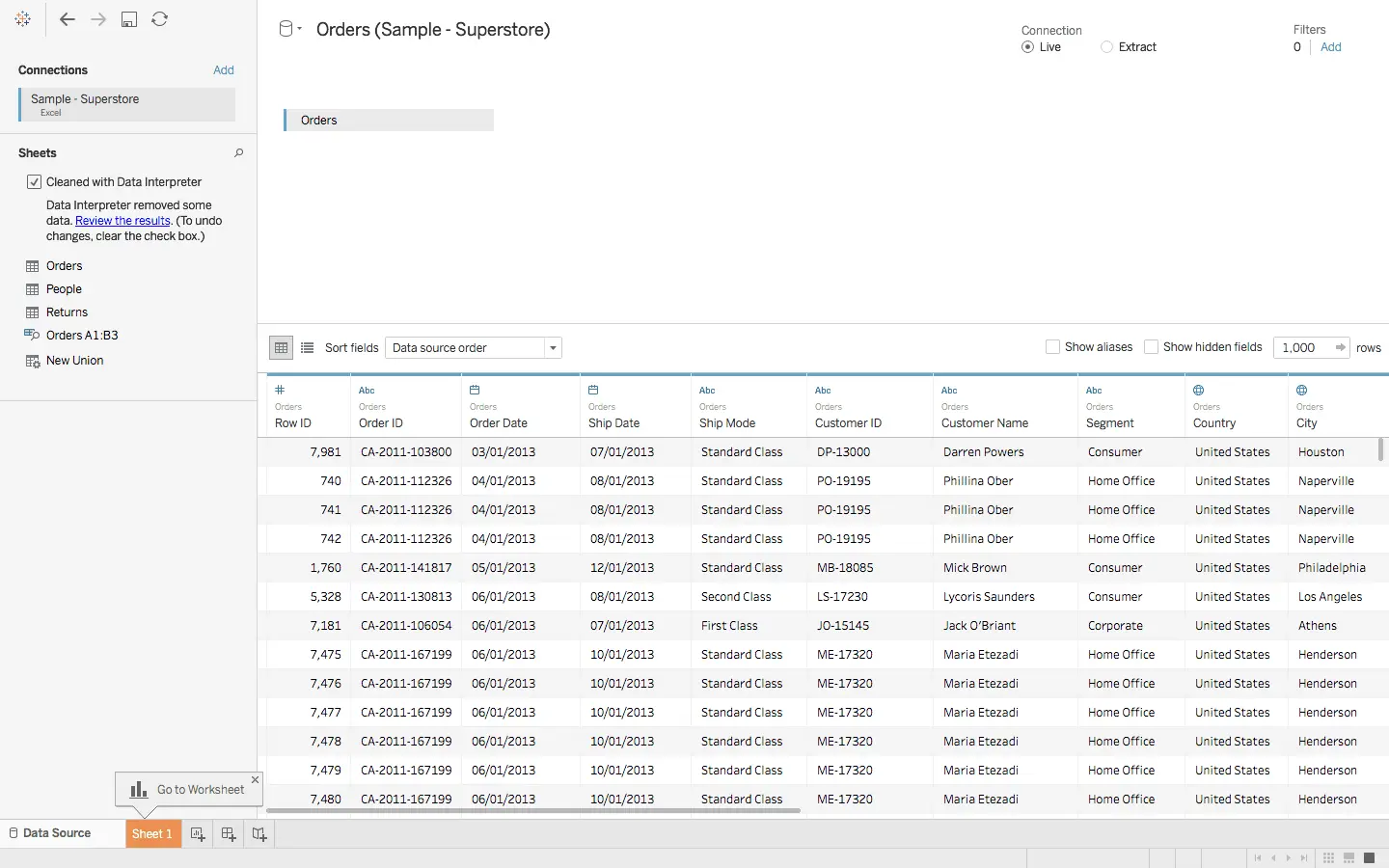 可以看到表结构已经正常了,在数据清洗的过程中,Tableau 强大的数据分析功能已经初见端倪。你甚至可以点击 Review ths results 看看它是如何清洗数据的:点击后会下载一份分析 Excel,其中过滤掉的数据会被标记,自动分析出的表结构会被高亮。