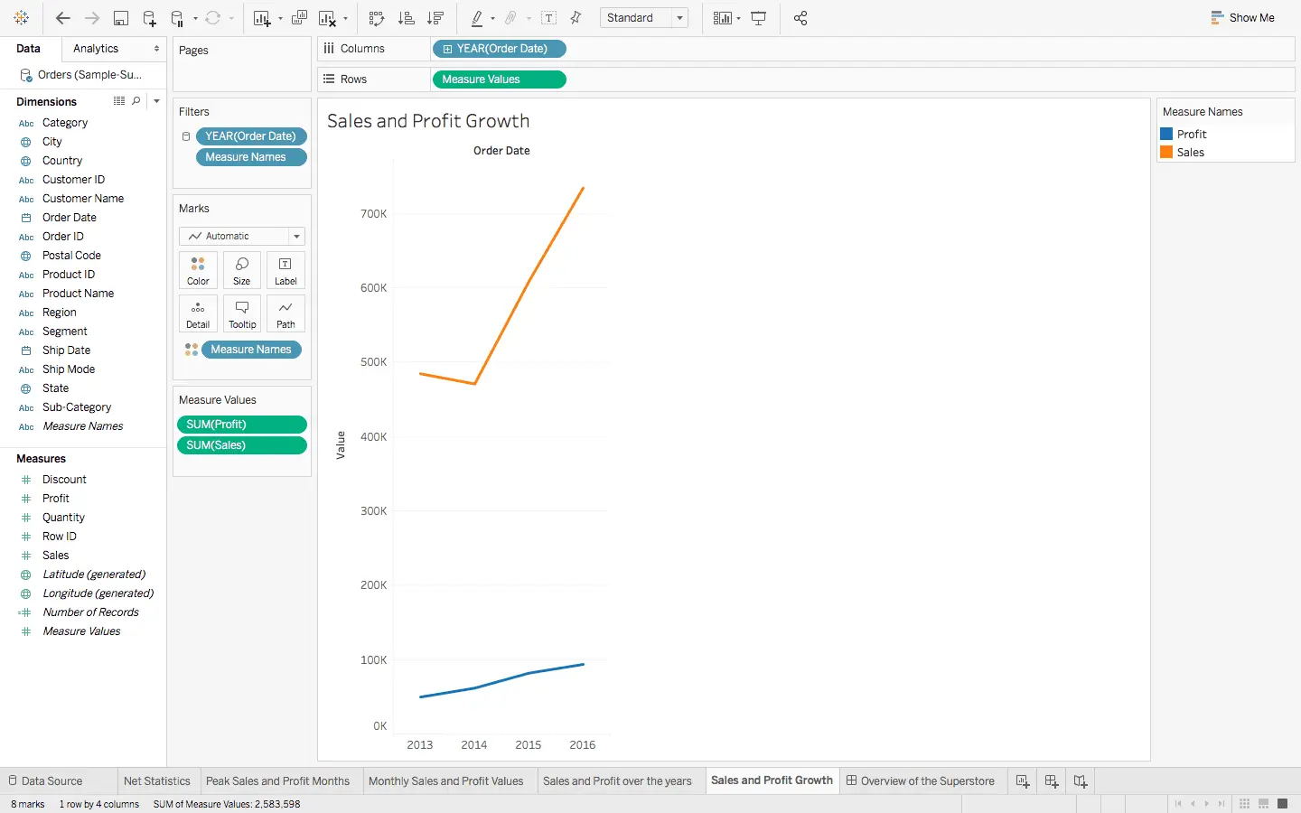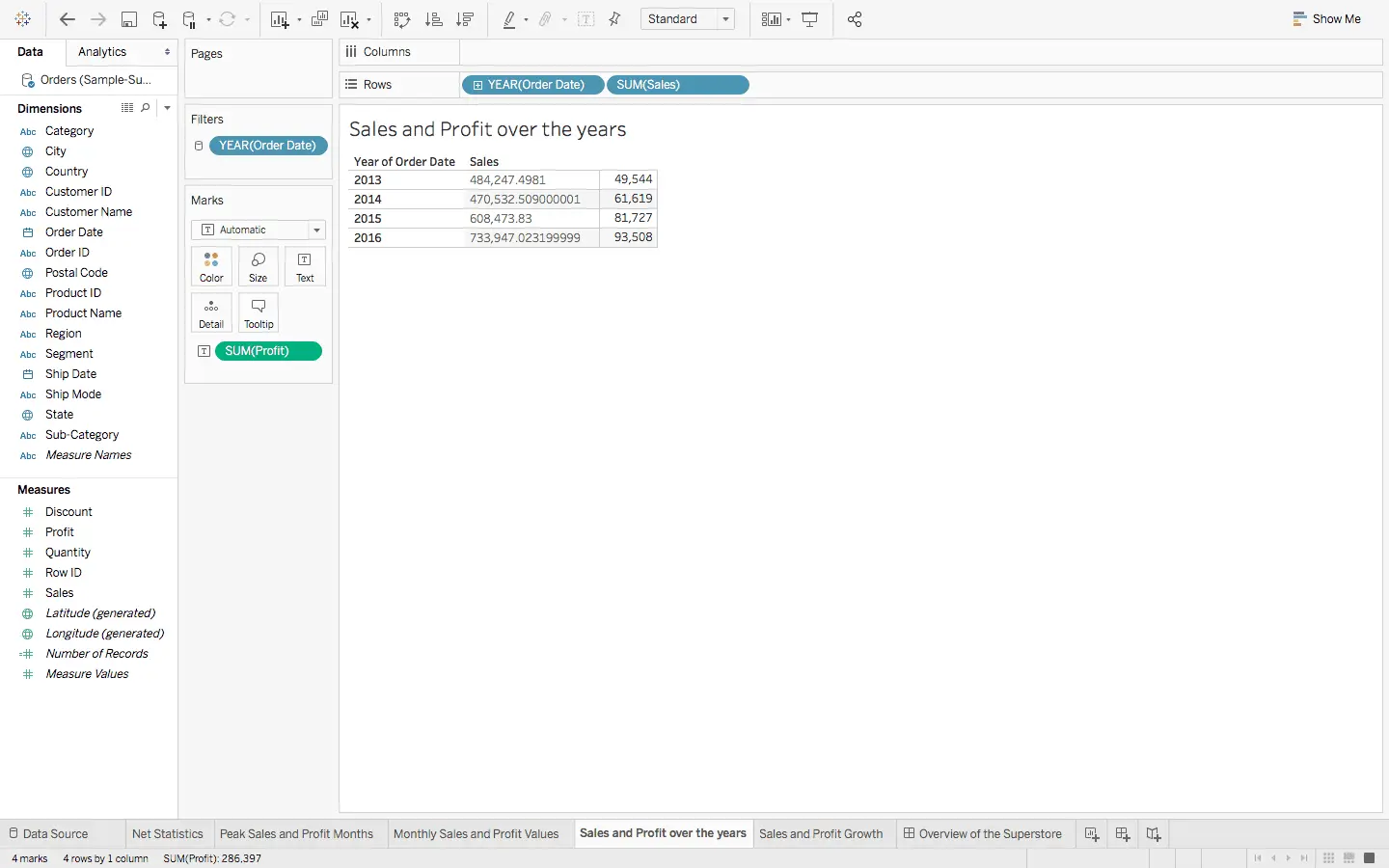 - 将 Sales 与 Profit 拖拽到 Rows。