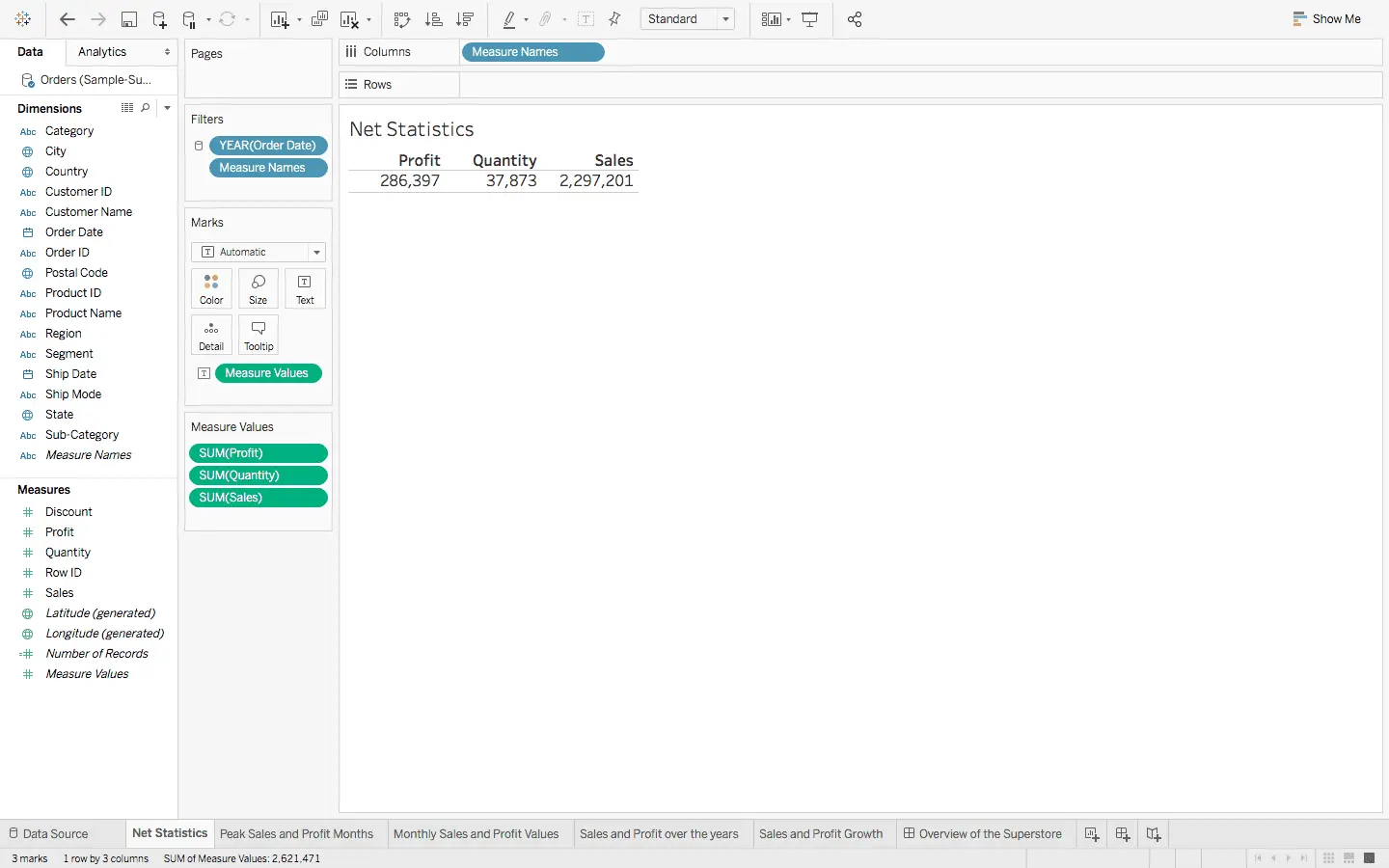 可以看到,总利润大概是总销量的 10%。如果想展示横向表格,将 Measure Names 从 Rows 拖拽到 Columns 即可。