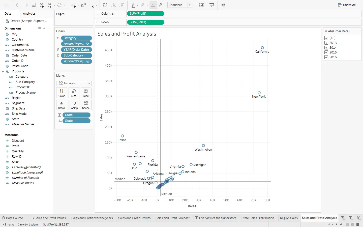 可以看到数值越大的区域一般颜色也越深,但这不是分析利润/销量性价比的最佳方式,我们先只看到加州和纽约是销售业绩最好的区域,而科罗拉多州虽然销量不错,但利润却是负的。