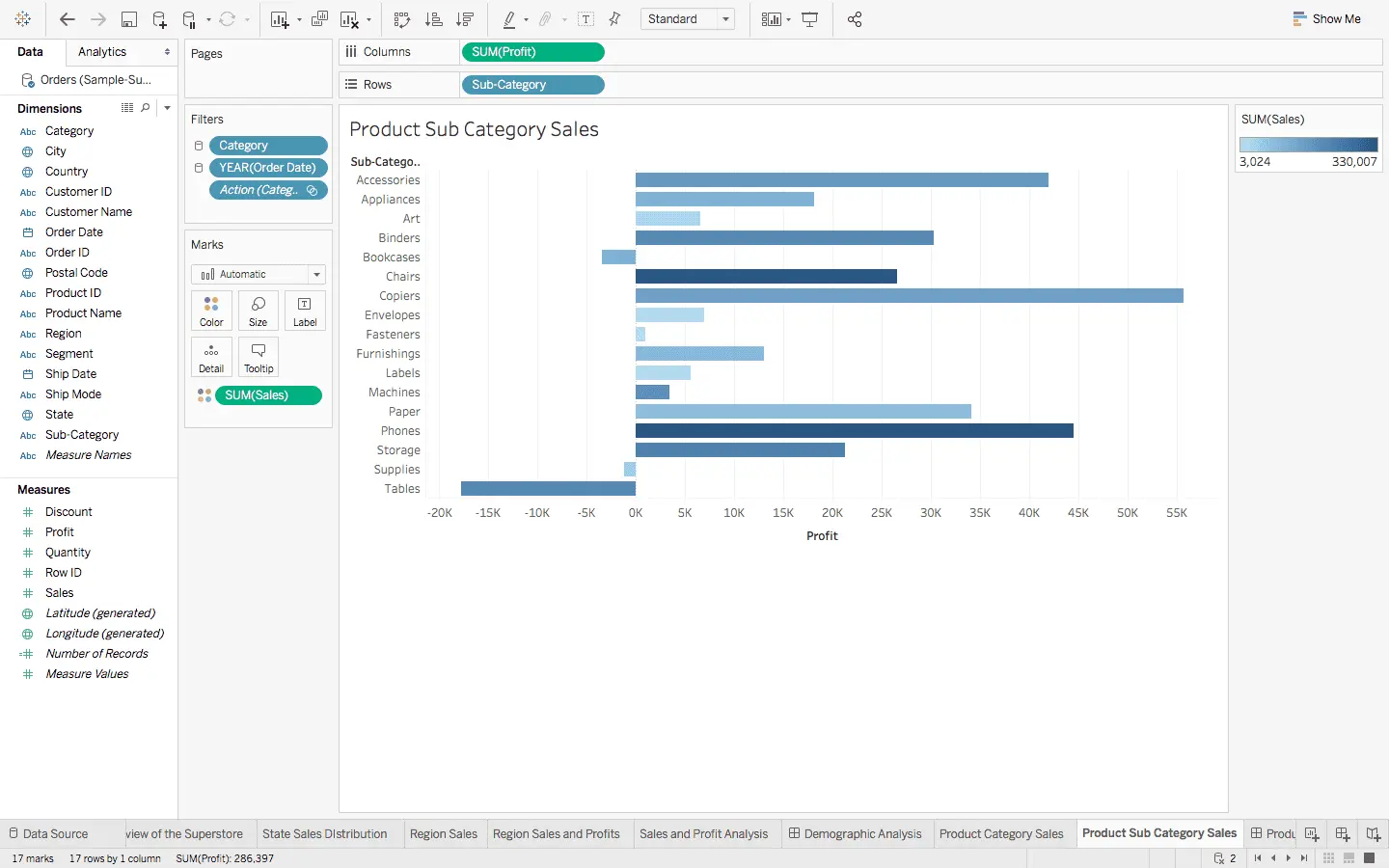 可以明显看到 Copiers 就是性价比之王,拥有最高的利润,但销量却不是很高(颜色深度中等),而桌子是性价比最低的,利润为负,而且销量不低。