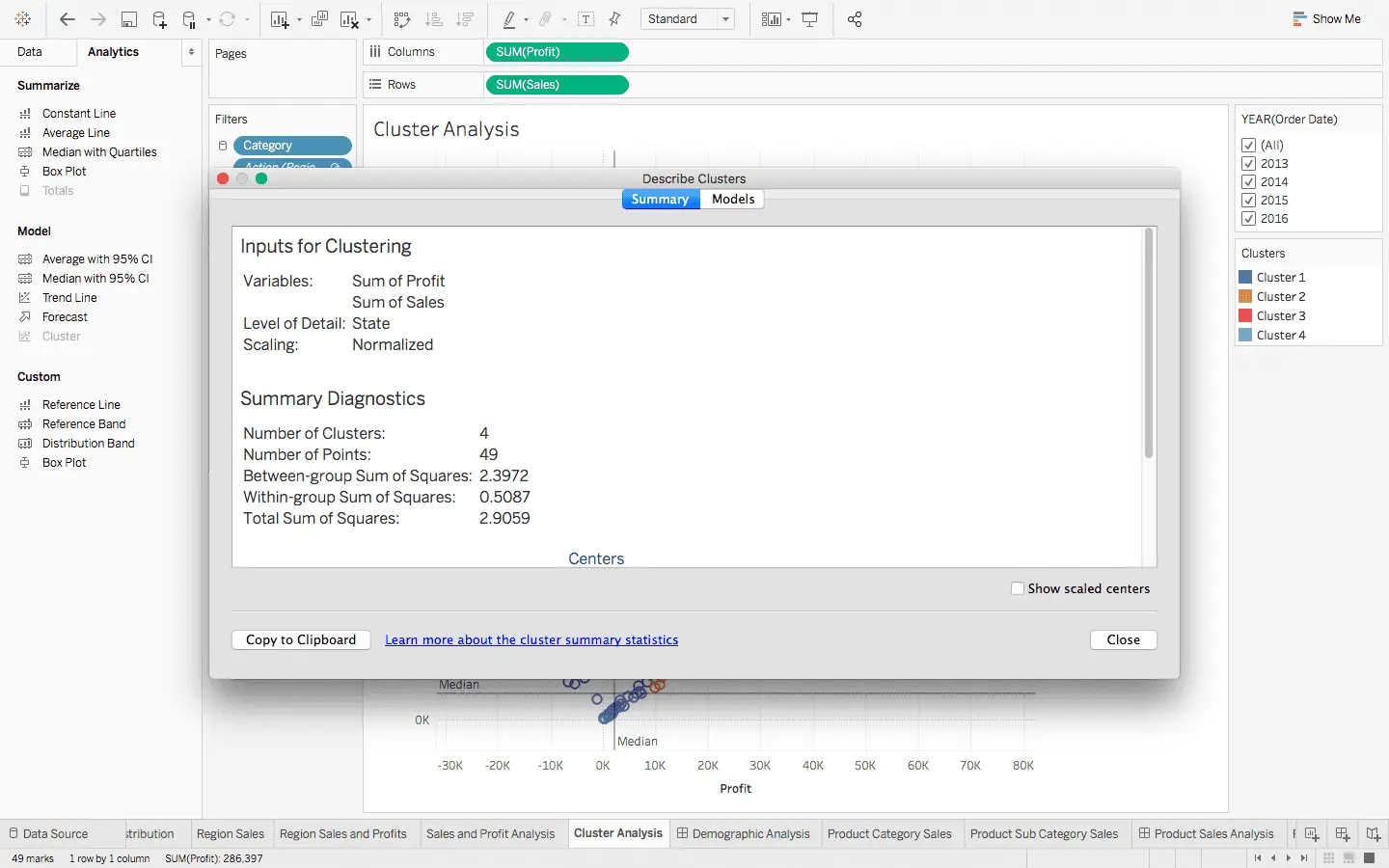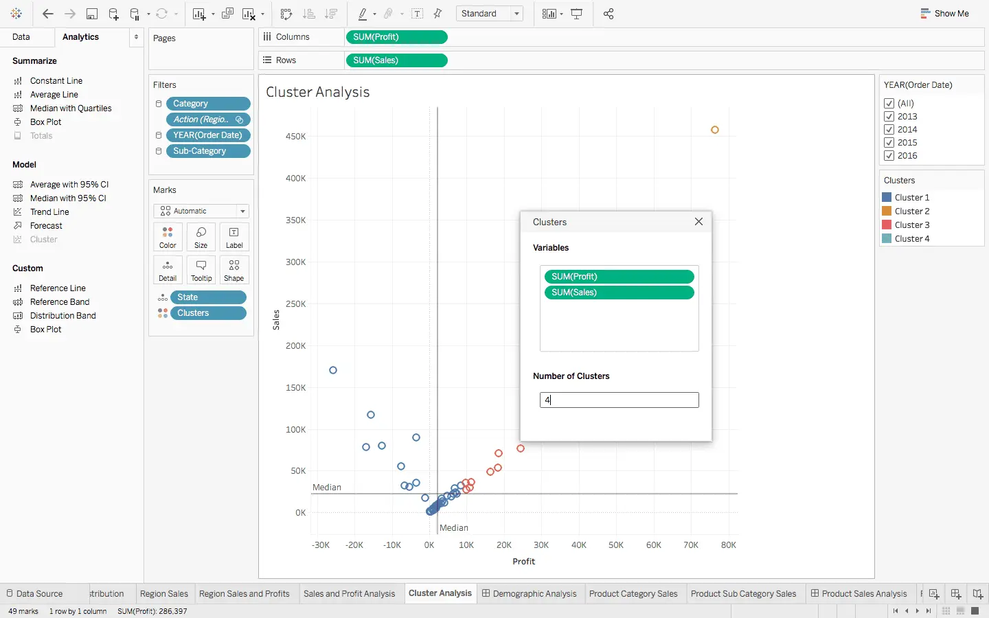 象限图的四象限是多维度综合判断的法则,然而 Tableau 支持的聚类分析可以自动做到这些: