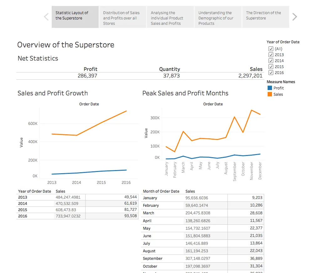 我们可以看到,无论是销量还是利润都在逐年上升。接下来我们想具体看看每个月份的数据: