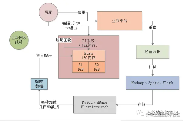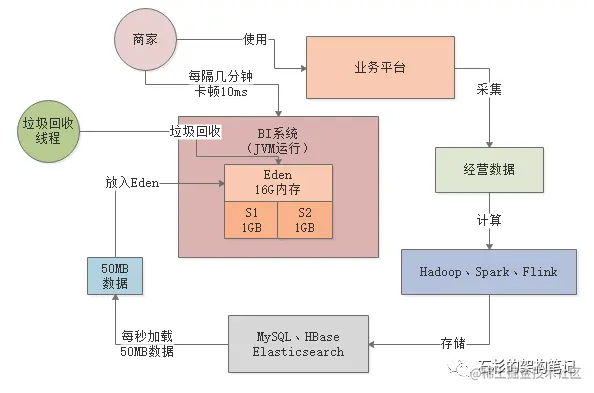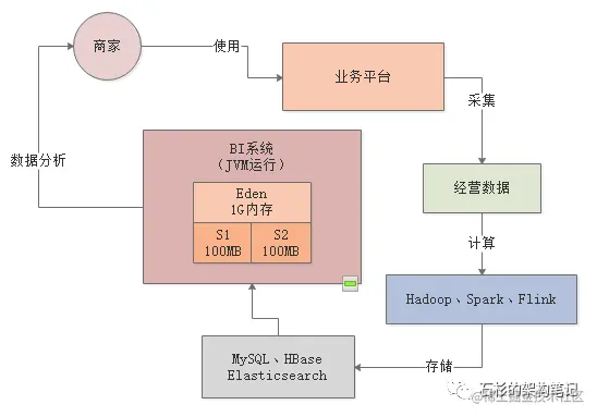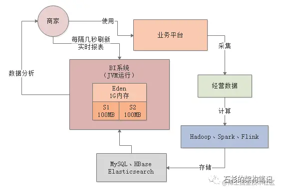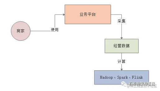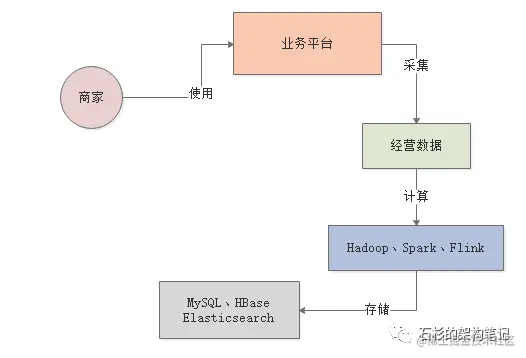 所以类似这样的一个BI系统,大致的运行逻辑如下所示,首先从我们提供给商家日常使用的一个平台上会采集出来很多商家日常经营的数据。