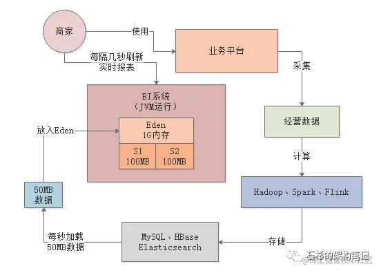 其实大家都已经发现上述系统的问题了,在上述系统运行模型下,基本上每秒会加载50MB的数据到Eden区中。