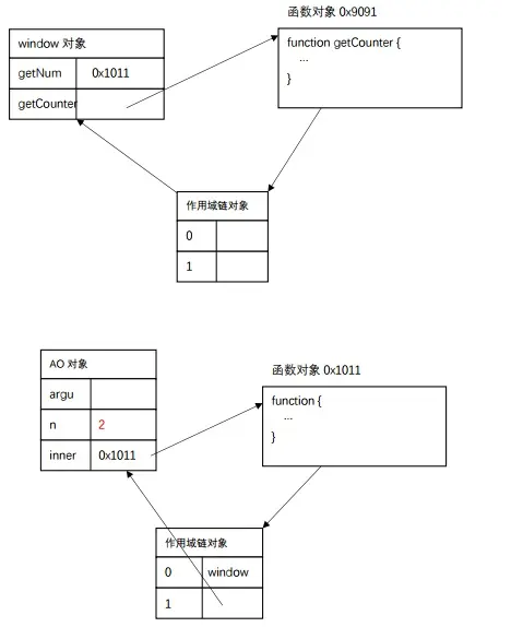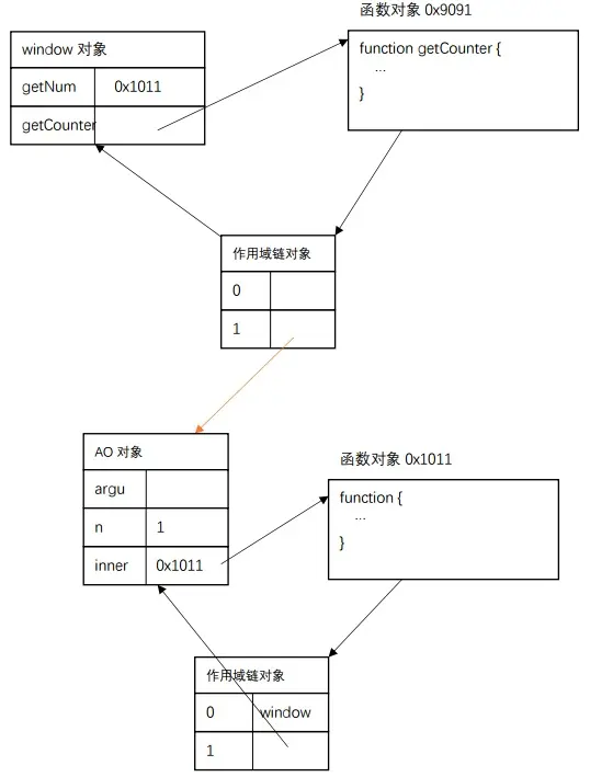 直接上图,点击图片放大查看。要记住函数对象、作用域链对象、执行环境(EC)和活动对象(AO)这几个东西都啥时候出现,啥时候消失。